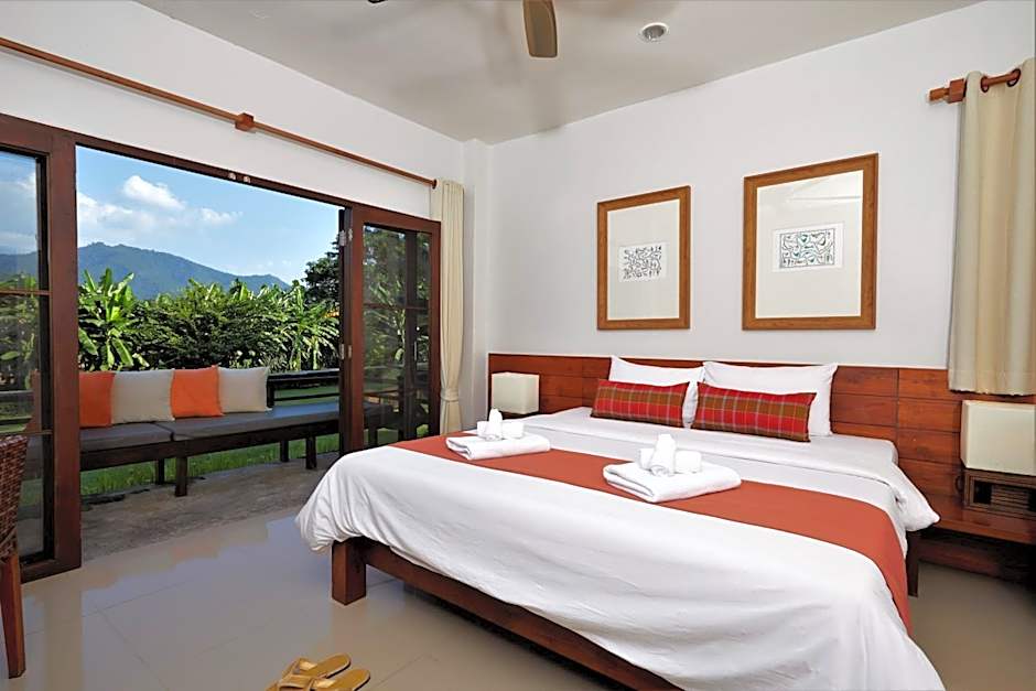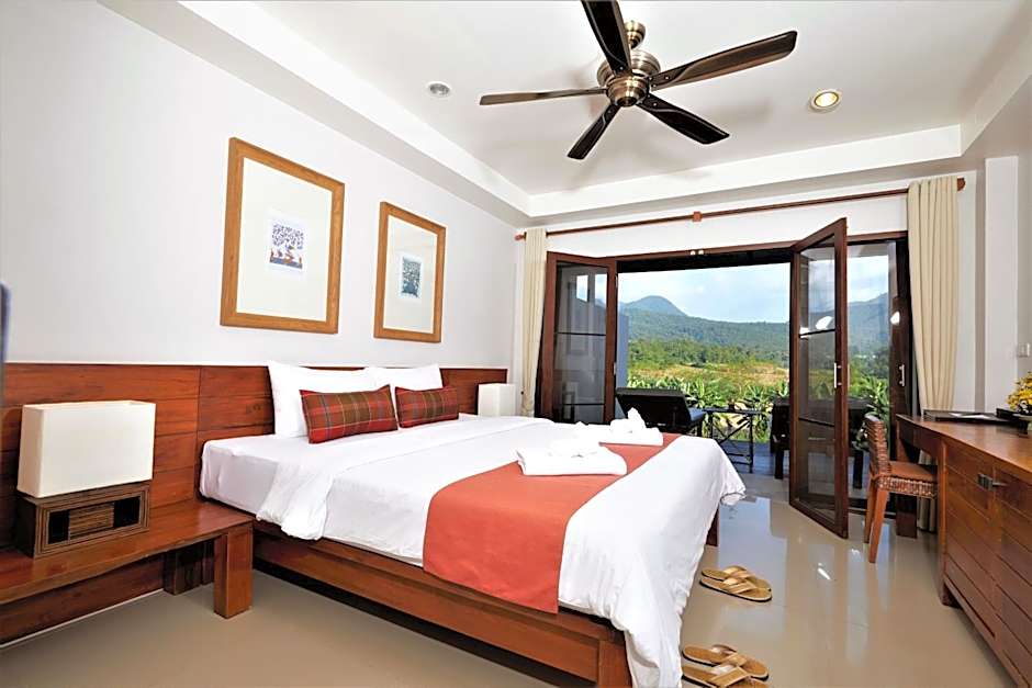 Boutique-style villa features a private balcony with view of the mountain range.